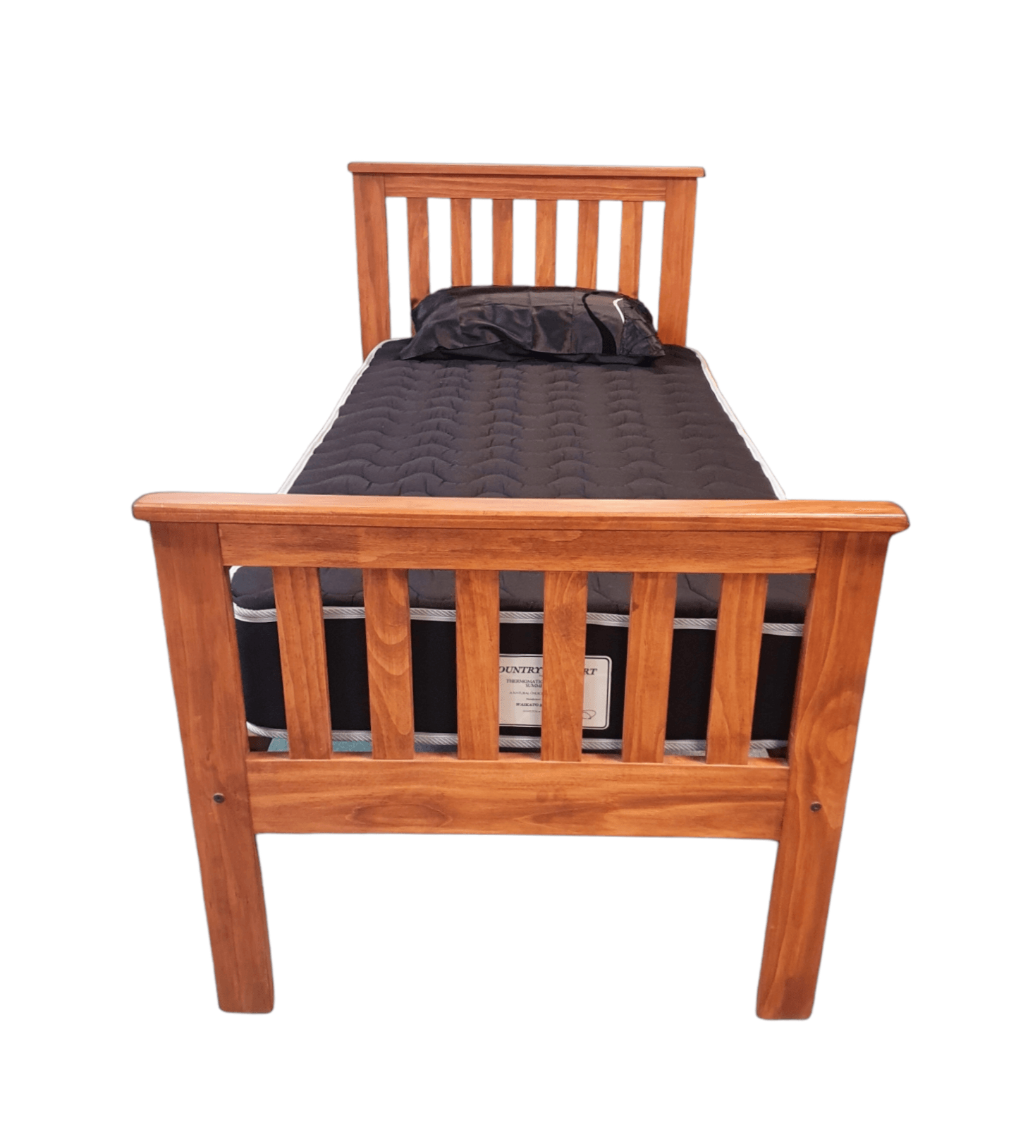 The frame shown in picture is a Woodsman with High end footboard made with Pine and has a Rimu stain.