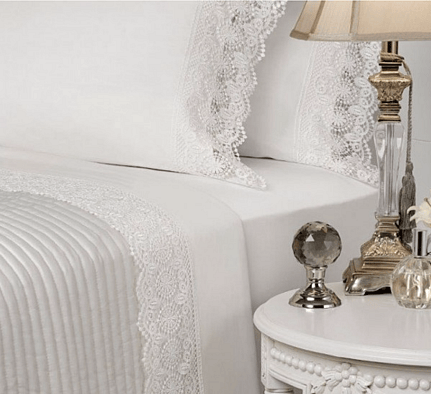 100% cotton sateen with guipure lace trim along cuff hem of flat sheet and pillowcase.